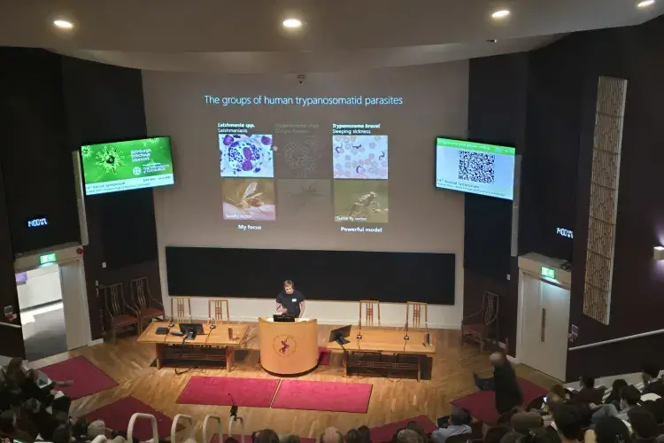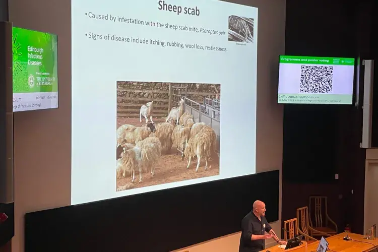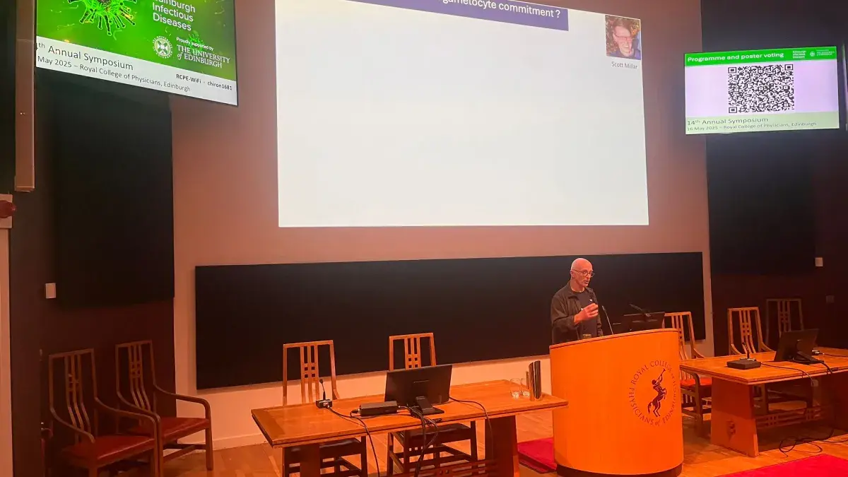 May 2025: On Friday 16 May colleagues gathered at the Royal College of Physicians in Edinburgh for Edinburgh Infectious Diseases' 14th Annual Symposium. It was a successful day sharing research and building connections. EID symposium at the Royal College of Physicians, Edinburgh The day began with presentation of the Ker Memorial Prize. The Prize is awarded each year to the student submitting the best PhD thesis in infectious diseases, and is given in memory of two eminent infectious disease physicians, Drs Claude Buchanan Ker, and his son Frank Leighton Ker.This year the winner was Dr Catherine Oke, from the School of Biological Sciences, for her PhD thesis on the evolutionary ecology of vector-parasite interactions in malaria infection. 2025 Ker Memorial Prize awarded for work on vector-parasite interactions Wide breadth of research in Edinburgh As the day went on, attendees heard from a number of Edinburgh speakers, showcasing the breadth and depth of infectious disease research happening across Edinburgh. We were delighted to welcome Melita Gordon (Usher Institute), who has recently joined the University of Edinburgh, to talk about her work to prevent invasive Salmonella disease in Africa. Closer to home, Stew Burgess (Moredun Research Institute) gave a most insightful presentation about sheep scab and efforts to control the disease in Scotland, and Amy Sweeny (School of Biological Sciences) presented work on community ecology & infectious disease, based on study of the wild Soay sheep population on St Kilda.After lunch, more recent recruits, Richard Wheeler and Maria Forlenza discussed different insights from their research on trypanosomatid parasites, before Ting Shi presented work to develop a sleeper framework protocol for emerging epidemics and pandemics, and Ross Fitzgerald described the inter-species spread and versatility of Staphylococcus aureus. Showcasing Early-Career Researchers A large aim of the EID Symposium is to showcase the work of the talented researchers early in their careers. For this year's Symposium, 6 ECRs from across the University presented a 'flash talk'. This format allowed for a talk length of just 4 minutes and a maximum of 3 slides - a tough ask!Vayalena Drampa and Chris Banks (Roslin Institute), Kalyani Sharma (Institute for Regeneration and Repair) and Josh Richards, Kyriaki Neophytou and Martha Kivecu (School of Biological Sciences) presented work ranging from the rapid diagnostics for urinary tract infection, to replication of influenza A virus, and the origin of Plasmodium falciparum. ECRs were praised for their clear presentations and impressive level of work being done. And many thanks to Georgia Perona-Wright for keeping everyone to time! Tackling interdisciplinarity The plenary talks were broken up with a panel session before lunch led by Matt Silk and Iris Mair (School of Biological Sciences) who were discussing the tough topic of interdisciplinarity and how to work effectively across disciplines.Audience members participated in a live survey about their experienes of working across disciplines - both the rewards and the challenges. These shared responses will be taken forward to help develop EID activities that explore and support interdisciplinary approaches. Word cloud of answers to the question: 'In what ways was the process (of working across disciplines) rewarding? Poster competition Throughout the day, 2 poster competitions were run - best student poster and best staff/postdoc poster. Attendees were encouraged to look around the posters during the breaks, talking to the authors about their research and then voting for the poster they thought was the best.A big congratulations to Anneza Abid from Edinburgh Napier University whose poster 'Host Defence Peptides, LL-37 and D-LL37, as novel therapeutic approaches for Mycobacterial infections' won the best student prize and to Rose Blake from the Roslin Institute whose poster 'Genome-Scale CRISPR-Cas9 Knockout Screen in Avian Cells Identifies Host Factors Essential for Influenza Virus Infections' won the best staff/postdoc prize. Ker Memorial Prize Lecture The event was rounded off by Ker Memorial Lecture which was delivered by Professor Andy Waters from the University of Glasgow. Professor Waters' talk 'Malaria parasite transmission: towards the end of the beginning' showcased his 30+ years experience in malaria research, discussing exciting new work to tackle malaria and emergent drug resistance.We are very grateful to Andy for accepting our invitation and delivering a fantastic lecture. Professor Andy Waters delivering the 2025 Ker Memorial Prize Lecture 'Malaria parasite transmission: towards the end of the beginning'. Related links Professor Andy WatersRoyal College of Physicians Annual Symposium event page Publication date 19 May, 2025